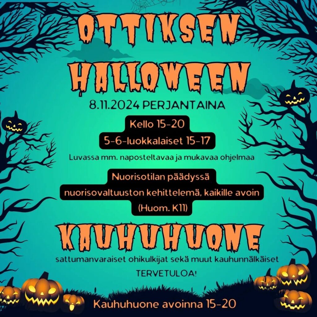 Ottiksella vietetään tuttua Halloween ”disko” iltamia ja nuorisotilan päädyssä pääsee kello 15.00-20.00 erillisestä sisäänkäynnistä nuvalaisten ja nuorisotoimen yhdessä luomaan karmivan kauheaan KAUHUHUONEESEEN!![]()