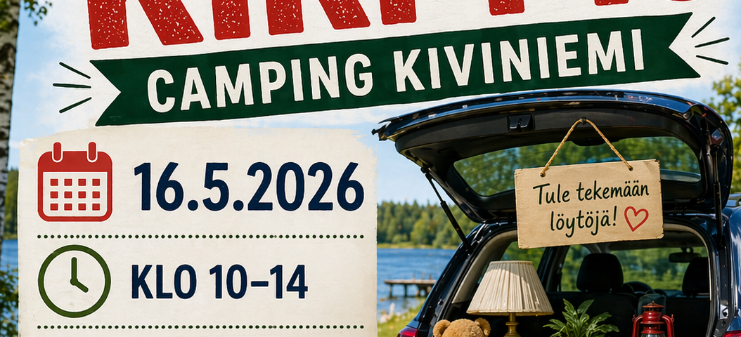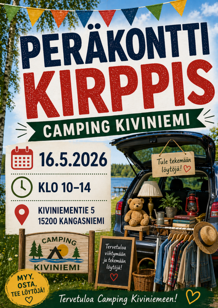 Kaapit täynnä? Puoliso huomauttelee? Ratkaisu löytyy täältä 👇 Peräkonttikirppis Camping Kiviniemessä – tuo tavarat, myy pois ja palaa kotiin sankarina 😄 Tai tule ostamaan muiden “pakko päästä eroon” -aarteet halvalla.