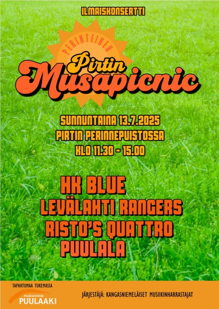 Perinteinen ilmaiskonsertti Pirtin Musapicnic tarjoaa kevyttä livemusiikkia mm. jazzia, poppia, iskelmää ja ”ralleja” kangasniemeläisten musiikinharrastajien esittäminä kauniin puiston siimeksessä.