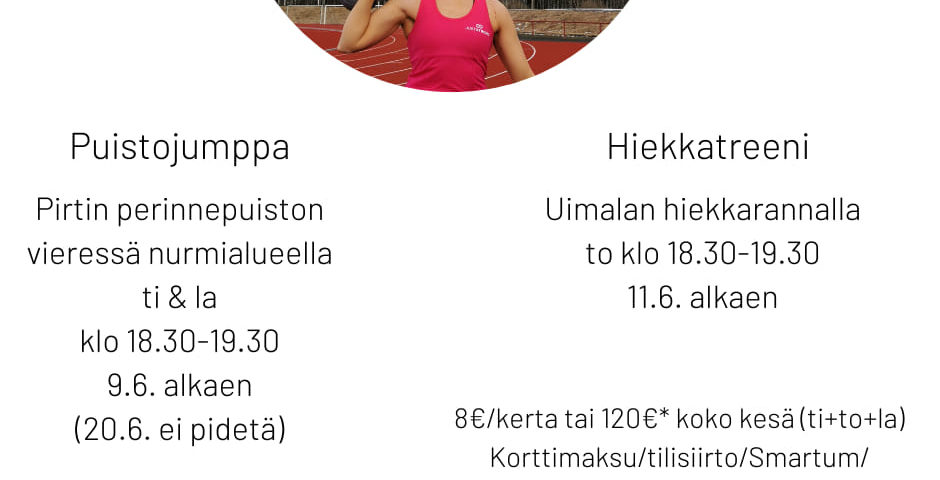 Puistojumppaa 9.6. – 17.7.2020 tiistaisin ja lauantaisin Pirtin Perinnepuiston nurmikolla ja torstaisin Uimalan hietikolla.