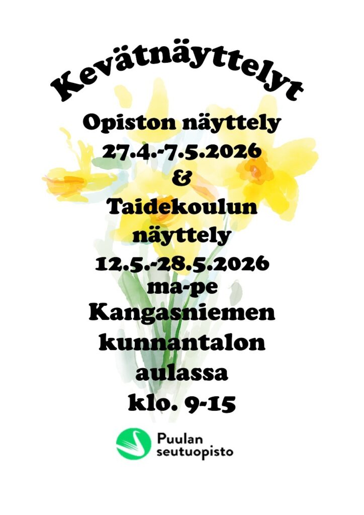 Puulan seutuopiston Kevätnäyttely Näyttely avoinna ma-pe klo 9-15. Kunnantalo Tapahtuman tiedot Päivämäärä Alkaa: 27.4.2026 klo 9.00 Päättyy: 7.5.2026 klo 15.00 Tapahtuman sijainti Kunnantalon aula, Otto Mannisen tie 2 Tapahtumaluokka Näyttely