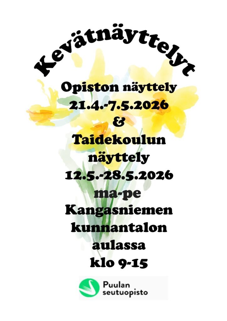 Puulan seutuopiston Kevätnäyttely Näyttely avoinna ma-pe klo 9-15. Kunnantalo Tapahtuman tiedot Päivämäärä Alkaa: 21.4.2026 klo 9.00 Päättyy: 7.5.2026 klo 15.00 Tapahtuman sijainti Kunnantalon aula, Otto Mannisen tie 2 Tapahtumaluokka Näyttely