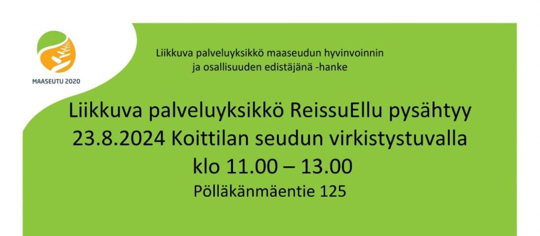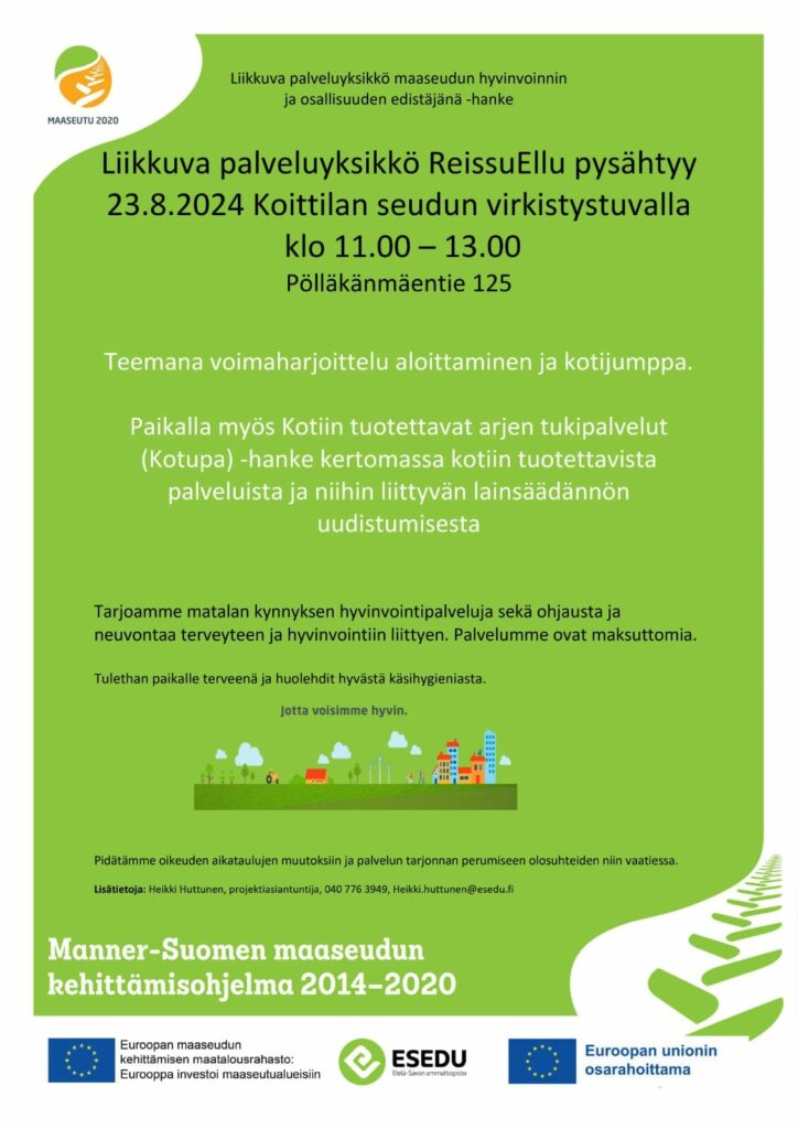 ReissuEllu Koittilan seudun virkistystuvalla Teemana voimaharjoittelun aloittaminen ja kotijumppa. Tapahtuman tiedot Päivämäärä Alkaa: 23.8.2024 klo 11.00 Päättyy: 23.8.2024 klo 13.00 Tapahtuman sijainti Pölläkänmäentie 125 Tapahtumaluokka Muu