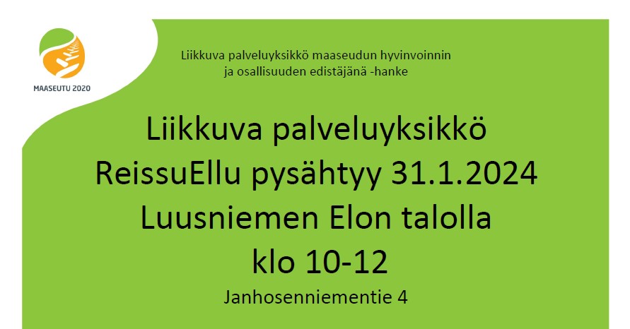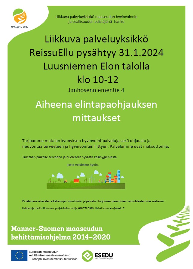 ReissuEllu Luusniemellä Aiheena elintapaohjauksen mittaukset. Tapahtuman tiedot Päivämäärä Alkaa: 31.1.2024 klo 10.00 Päättyy: 31.1.2024 klo 12.00 Tapahtuman sijainti Luusniemen Elon talo, Janhosenniementie 4 Tapahtumaluokka Muu