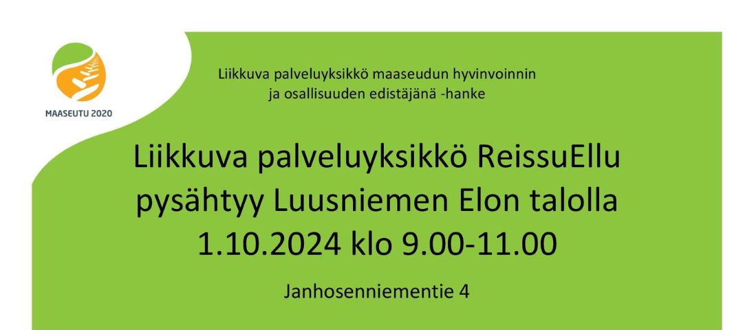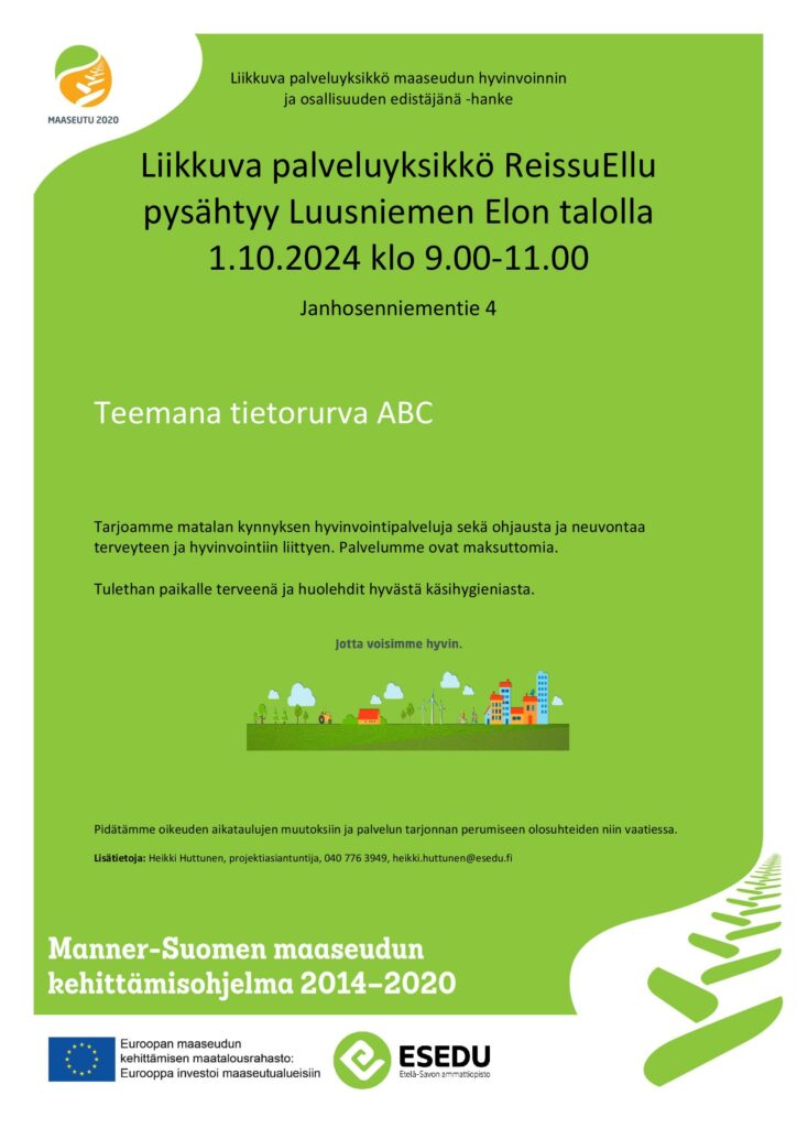 ReissuEllu Luusniemen Elon talolla Teemana tietoturva ABC Luusniemen Elon talo Tapahtuman tiedot Päivämäärä Alkaa: 1.10.2024 klo 9.00 Päättyy: 1.10.2024 klo 11.00 Tapahtuman sijainti Luusniemen Elon talo, Janhosenniementie 4 Tapahtumaluokka Muu