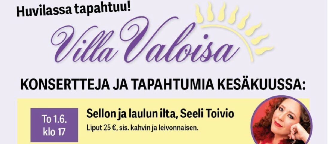 Sellon ja laulun ilta, Seeli Toivio Liput 25 €, sis. kahvi + leivos. Tapahtuman tiedot Päivämäärä Alkaa: 1.6.2023 klo 17.00 Päättyy: 1.6.2023 klo 18.30 Tapahtuman sijainti Villa Valoisa, Kirkkolahdenkuja 1 Tapahtumaluokka Kulttuuri Musiikki