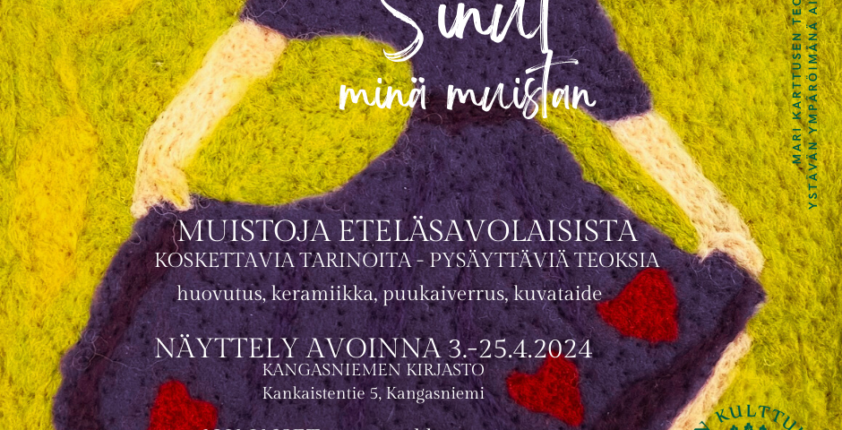 Tilaisuuden järjestää Mari Jalava, Jalavilla, Etelä-Savon kulttuurirahasto ja Kangasniemen kirjasto