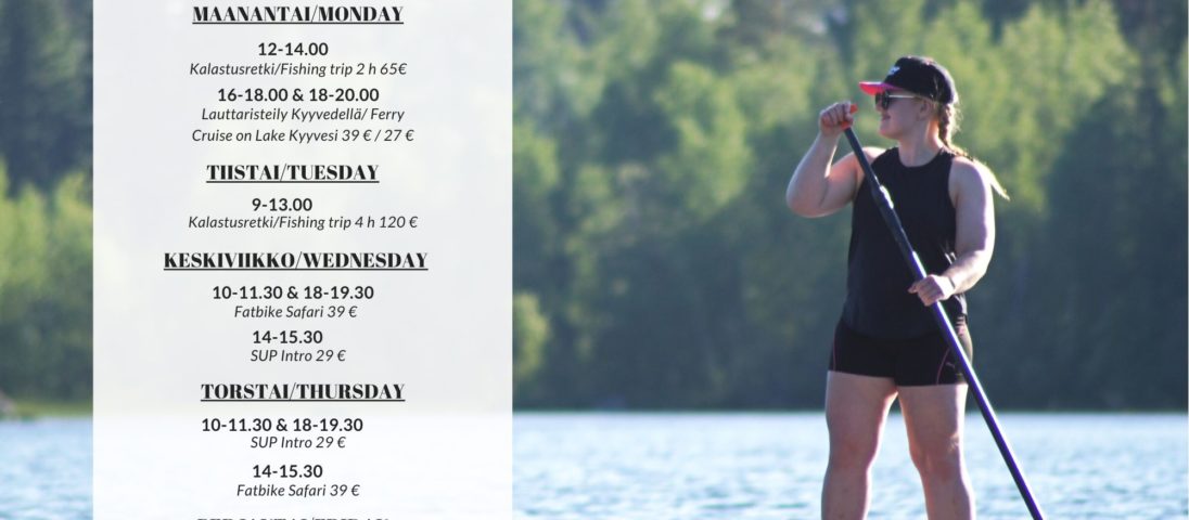 Varustus: Kevyet säänmukaiset liikuntavaatteet/uimapuku, pyyhe ja vaihtovaatteet. Aurinkoisella säällä päähine ja aurinkolasit ovat suositeltavat.