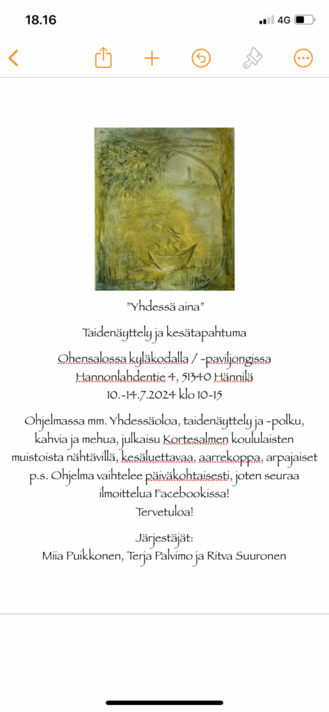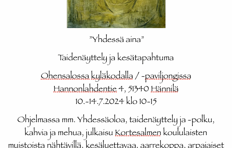 Taidenäyttely ja kesätapahtuma ”Yhdessä aina” Ohensalossa kyläpaviljongissa ja kodalla 10.-14.7.2024 klo 10-15.