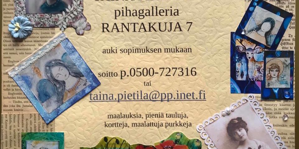 Taina Pietilän Pihagalleriassa esillä ja myytävänä maalauksia, pieniä tauluja, kortteja ja maalattuja purkkeja osoitteessa Rantatie 7.