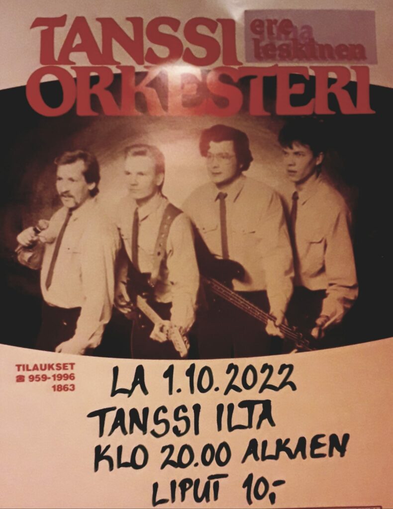Tanssi-ilta – Tanssiorkesteri Ere Leskinen Liput 10 € Tapahtuman tiedot Päivämäärä Alkaa: 1.10.2022 klo 20.00 Päättyy: 1.10.2022 klo 23.59 Tapahtuman sijainti Karhunpesä pub, Marjoniementie 1 Tapahtumaluokka Tanssi