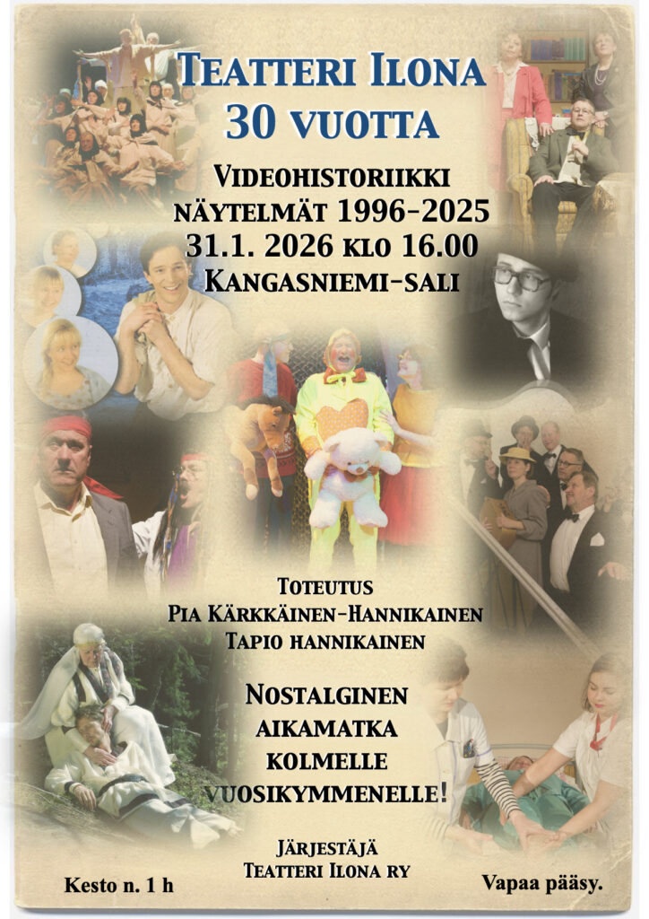 Teatteri Ilona tarjoaa yleisölleen tämän nostalgisen aikamatkan Kangasniemi-salissa lauantaina 31.1.2026 klo 16 alkaen. Historiikkia ei tulla julkaisemaan Youtubessa eikä muilla sosiaalisen median kanavilla, vaan se jää arkistoon kertomaan omaa tarinaansa Kangasniemen kulttuuritoiminnasta teatterin saralla vuosilta 1996-2025.