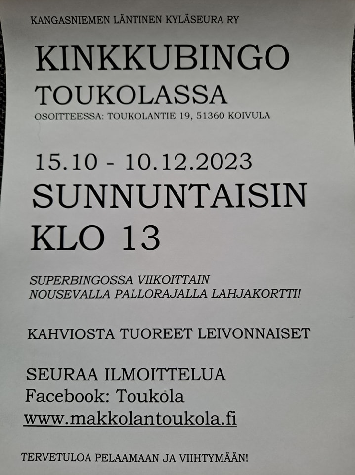 Kangasniemen Läntinen kyläseura ry järjestää 15.10.-10.12.2023 sunnuntaisin klo 13 kinkkubingon.