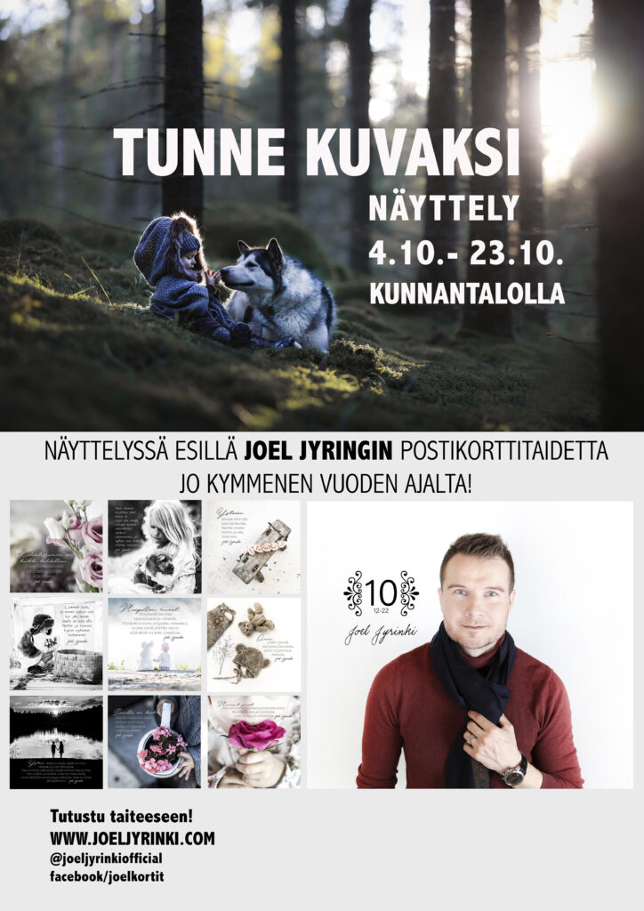 Tervetuloa Tunne kuvaksi –näyttelyyn 4.10.-23.10.2022 kunnantalolle. Esillä Joel Jyringin postikortti- ja valokuvataidetta kymmenen vuoden ajalta.