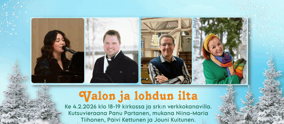 Valon ja lohdun ilta on noin tunnin mittainen rauhallinen ja levollinen iltahetki kirkossa ja verkon välityksellä. Illan lempeästä musiikista vastaa Niina-Maria Tiihonen, ja Jouni Kuitunen kertoo vilpittömään tapaansa Jumalan rakkaudesta, joka ulottuu elämän arjen keskelle. Päivi Kettunen puolestaan kohtaa illan kutsuvieraan ja johdattelee häntä kertomaan elämänsä käännekohdista. Tällä kertaa vieraana on Toivakan pappi Panu Partanen. Sydämellisesti tervetuloa viettämään hetki valon ja lohdun äärellä.