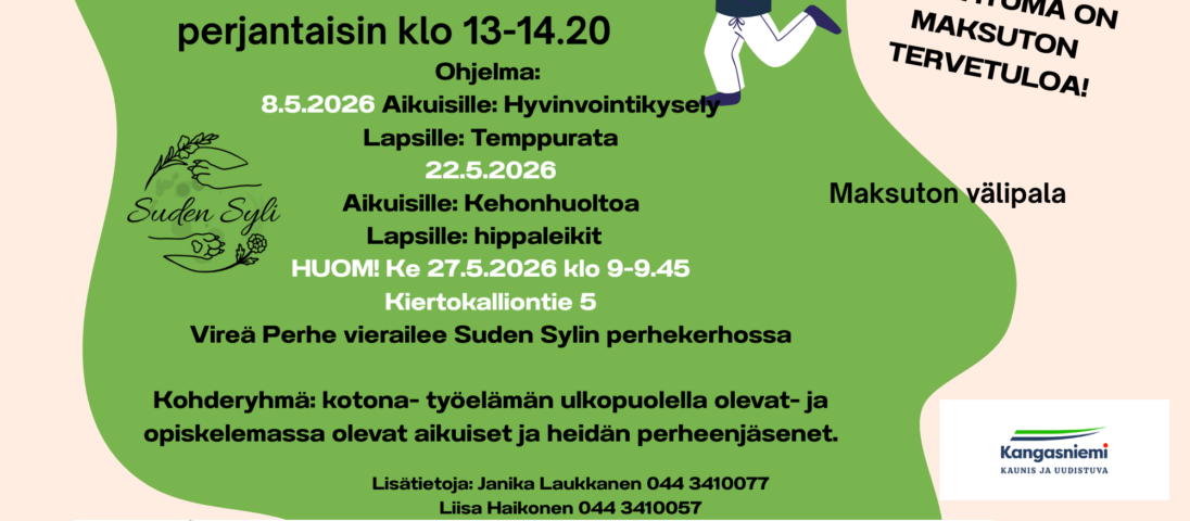 Vireä Perhe hankkeen maksuton perheliikuntakerho 8.5.2026 klo 13-14.20 Beckerin koulun liikuntasalissa.