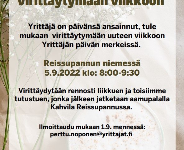 Yrittäjä on päivänsä ansainnut, tule mukaan virittäytymään uuteen viikkoon Yrittäjän päivän merkeissä Kahvila Reissupannun niemeen.