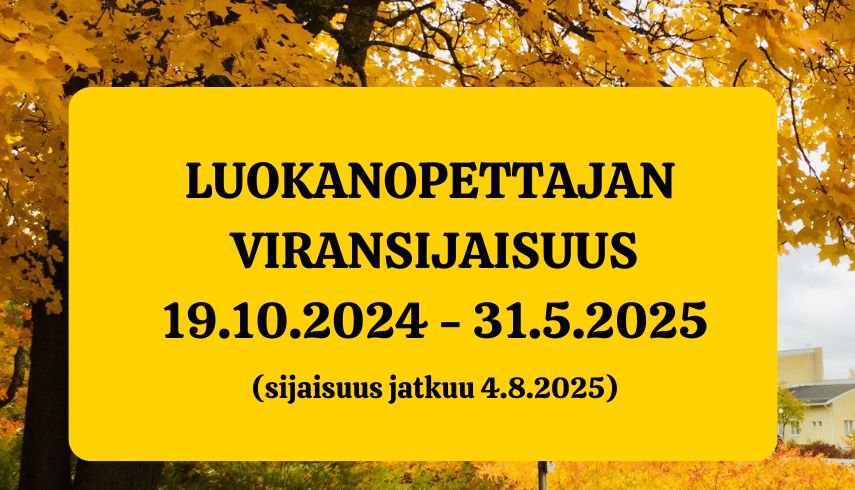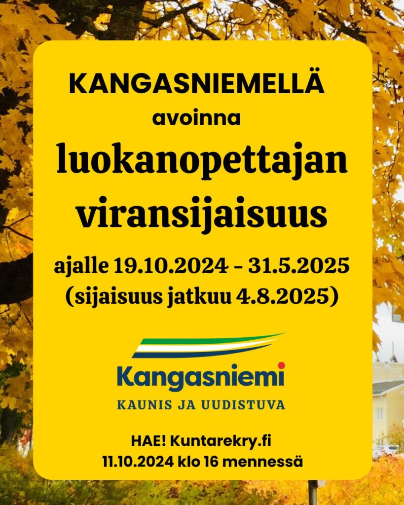 Kangasniemen perusopetuksessa on haettavissa luokanopettajan viransijaisuus ajalle 19.10.2024 – 31.5.2025. Sijaisuus jatkuu 4.8.2025 alkaen, mahdollisesti syyslukukauden loppuun saakka. Tehtävään kuuluu resurssi- ja erityisopettajan tehtäviä vuosiluokilla 3. – 6.