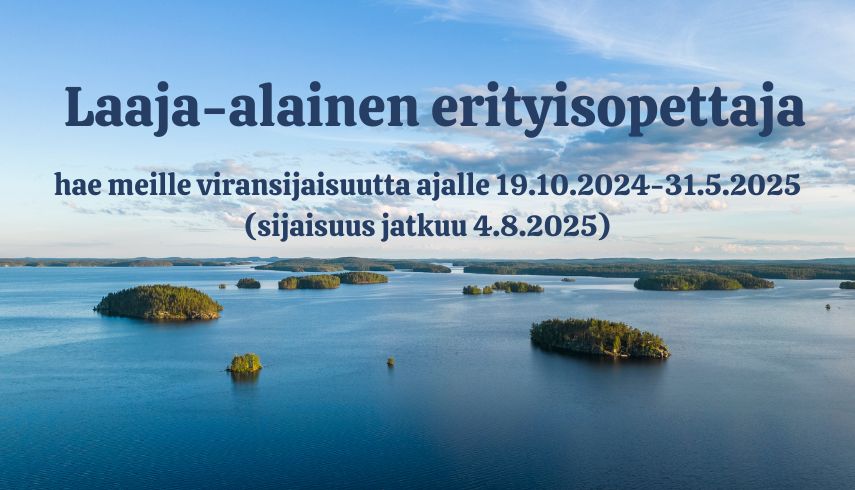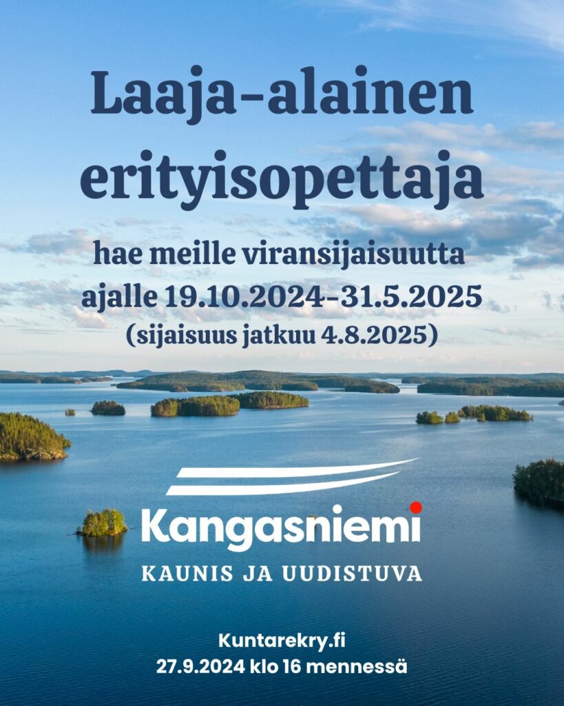 Kangasniemen perusopetuksessa on haettavissa laaja-alaisen erityisopettajan viransijaisuus ajalle 19.10.2024 – 31.5.2025. Sijaisuus jatkuu 4.8.2025 alkaen, mahdollisesti syyslukukauden loppuun saakka. Ensisijaisena sijoituspaikkana on Beckerin koulu. Tehtävään kuuluu myös opettaminen kyläkoululla, joten tehtävä edellyttää, että henkilöllä on auto käytettävissä.
