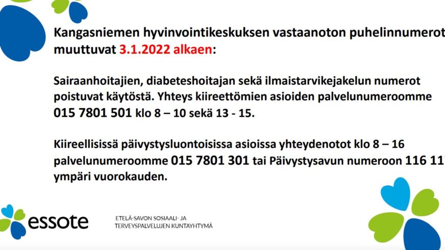 Sairaanhoitajien, diabeteshoitajan sekä ilmaistarvikejakelun numerot poistuvat käytöstä. Yhteys kiireettömien asioiden palvelunumeroomme 015 7801 501 klo 8 – 10 sekä 13 – 15.