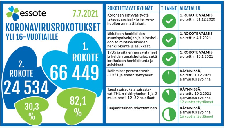 Essoten rokotusmittari näyttää 7.7.2021 rokotusten aloittamista yli 82 prosentille alueen 16 vuotta täyttäneestä väestöstä. Kakkosrokotteen on saanut yli 30 prosenttia.