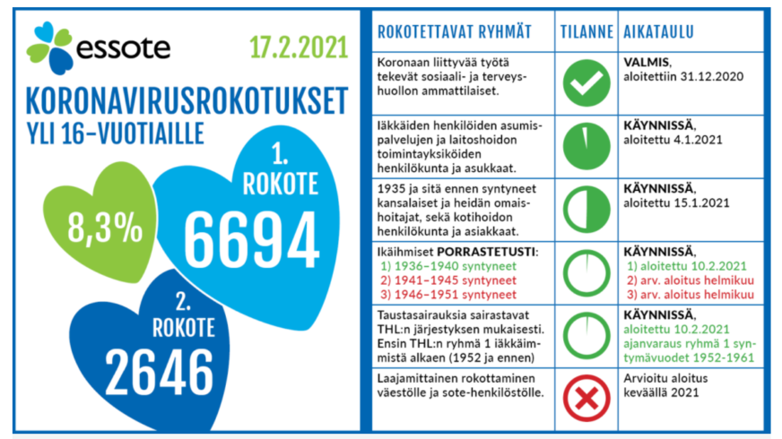 Essoten rokotusmittari näyttää 17.2.2021 lähes 6700 henkilön rokotusten aloittamista, mikä vastaa yli 8 prosenttia alueen yli 16-vuotiaasta väestöstä. Yli kaksi ja puoli tuhatta tehosterokotusta on myös jo annettu.