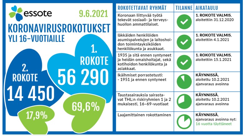 Essoten rokotusmittari näyttää 9.6.2021 rokotusten aloittamista yli 56 tuhannelle henkilölle, mikä vastaa lähes 70 prosenttia alueen 16 vuotta täyttäneistä.