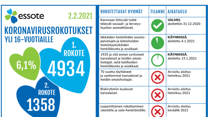 Essoten rokotusmittari näyttää 2.2.2021 lähes 5000 henkilön rokotusten aloittamista, mikä vastaa yli 6 prosenttia alueen yli 16-vuotiaasta väestöstä. Yli tuhat tehosterokotusta on myös jo annettu.