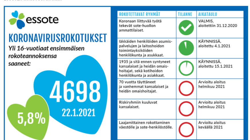 Essoten rokotusmittari näyttää 22.1.2021 reilusti yli 4000 henkilön rokotusten aloittamista, mikä vastaa liki 6 prosenttia alueen yli 16-vuotiaasta väestöstä.