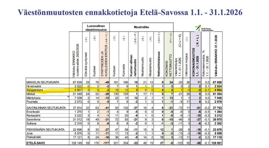 Etelä-Savon kunnista väkiluku väheni tammikuussa 2026 suurimmassa osassa, eniten Savonlinnassa (-37), Juvalla (-16) ja Rantasalmella (-10). Mikkelin seutukunnassa väestö kasvoi 11 henkilön verran, Savonlinnan seutukunnassa väestö väheni 61 henkilön verran ja Pieksämäen seutukunnassa väestö väheni 18 henkilön verran. Kangasniemen väkiluku väheni kolmen henkilön verran.
