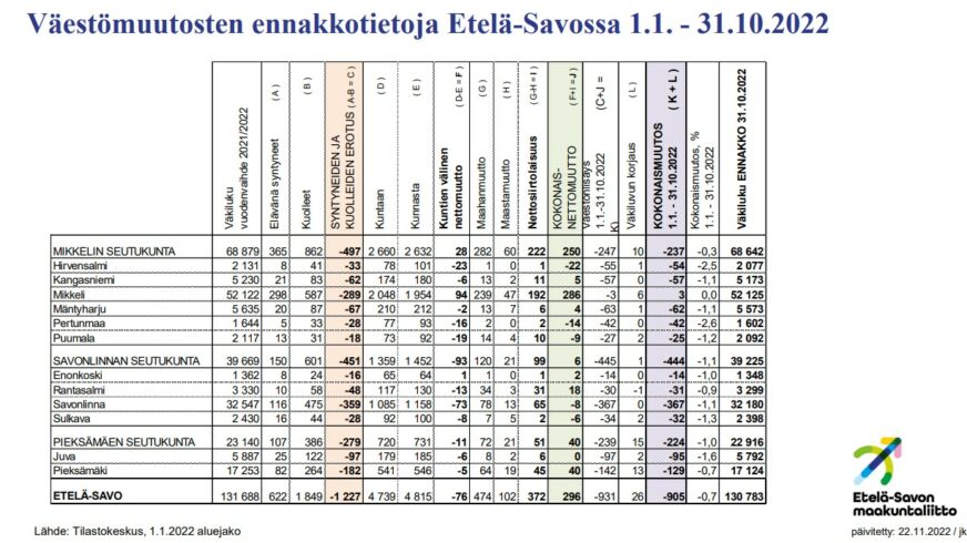 Väestönmuutosten ennakkotietoja kunnittain Etelä-Savossa 1.1.-31.10.2022 (pdf)