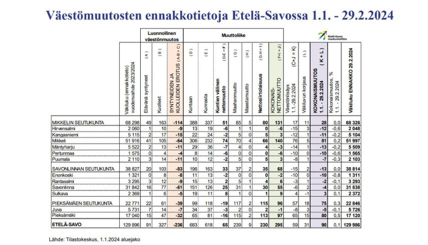 Väestönmuutosten ennakkotietoja kunnittain Etelä-Savossa 1.1.-29.2.2024 (pdf)