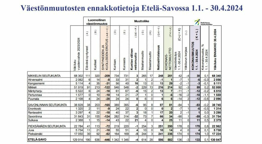 Väestönmuutosten ennakkotietoja kunnittain Etelä-Savossa 1.1.-30.4.2024 (pdf)