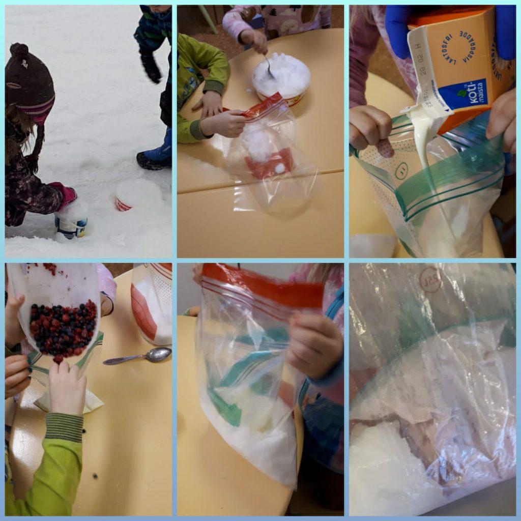 Aloitimme projektin hankkimalla ainesosat: kermaa, sokeria, suolaa ja erikokoisia minigrip-pusseja. Pienempään minigrip-pussiin sekoitettiin kerma ja sokeri – myös hunaja olisi toiminut. Suljettiin pussi ja asettiin se isompaan minigrip-pussiin. Isompaan minigrip-pussiin laitoimme paljon lunta. Lumen päälle kaadoimme paljon suolaa ja suljimme pussin. Heittelimme ja puristelimme pussia muutaman minuutin, ehkä jopa viisi minuuttia. Ja sitten jäätelö oli valmis.