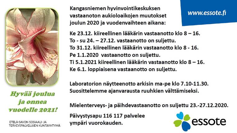 Hyvinvointikeskuksen aukioloajat joulun aikaan