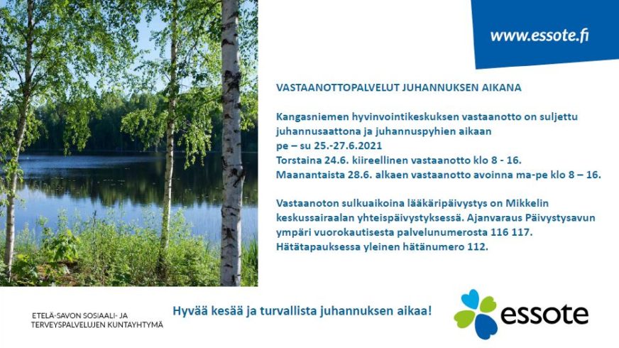 Vastaanoton sulkuaikoina lääkäripäivystys on Mikkelin keskussairaalan yhteispäivystyksessä. Ajanvaraus Päivystysavun ympärivuorokautisesta palvelunumerosta 116 117.