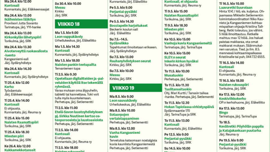 Oheiseen kalenteriin on koottu 24.4. – 21.5.2023 ikäihmisille suunnattua toimintaa.