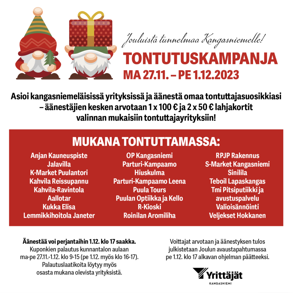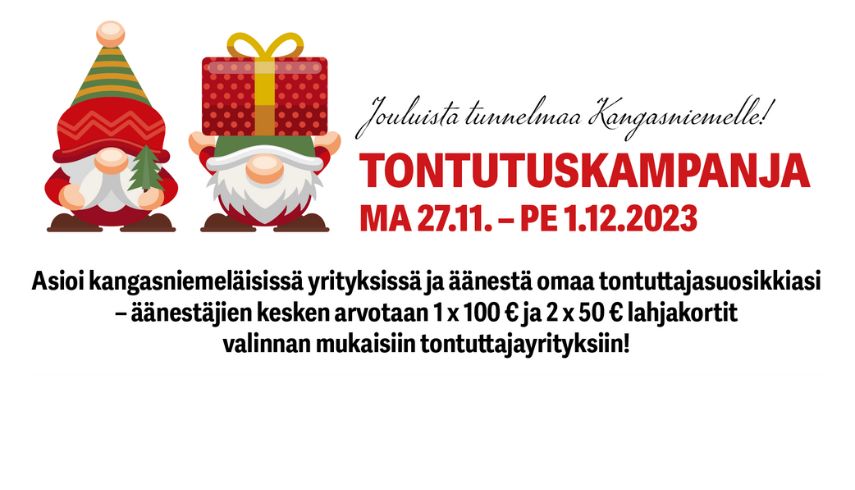Julkaistu: 16.11.2023 Jouluista tunnelmaa Kangasniemelle Tontutuskampanjalla 27.11.-1.12.2023 Asioi kangasniemeläisissä yrityksissä ja äänestä omaa tonttuttajasuosikkiasi.