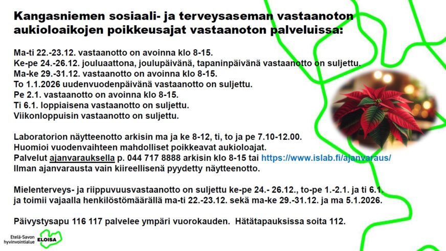 Kangasniemen sosiaali-ja terveysaseman vastaanoton aukioloaikojen poikkeusajat vastaanoton palveluissa: