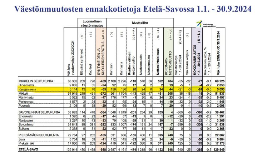 Kokonaisnettomuutto oli tammi-syyskuussa 2024 positiivinen kaikissa Etelä-Savon seutukunnissa;