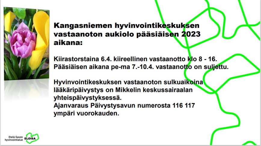 Pääsiäisen aikana pe-ma 7.-10.4. vastaanotto on suljettu.