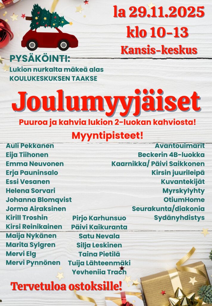 Ruokalassa pääset joulumyyjäistunnelmaan jo klo 10 lähtien ja pihalla alkaa klo 11 Joulun avaus -tapahtuma. Myyjäisissä mukana 30 myyntipistettä ja lisäksi lukion 2-luokan kahviossa myynnissä kahvin lisäksi mm. joulupuuroa.