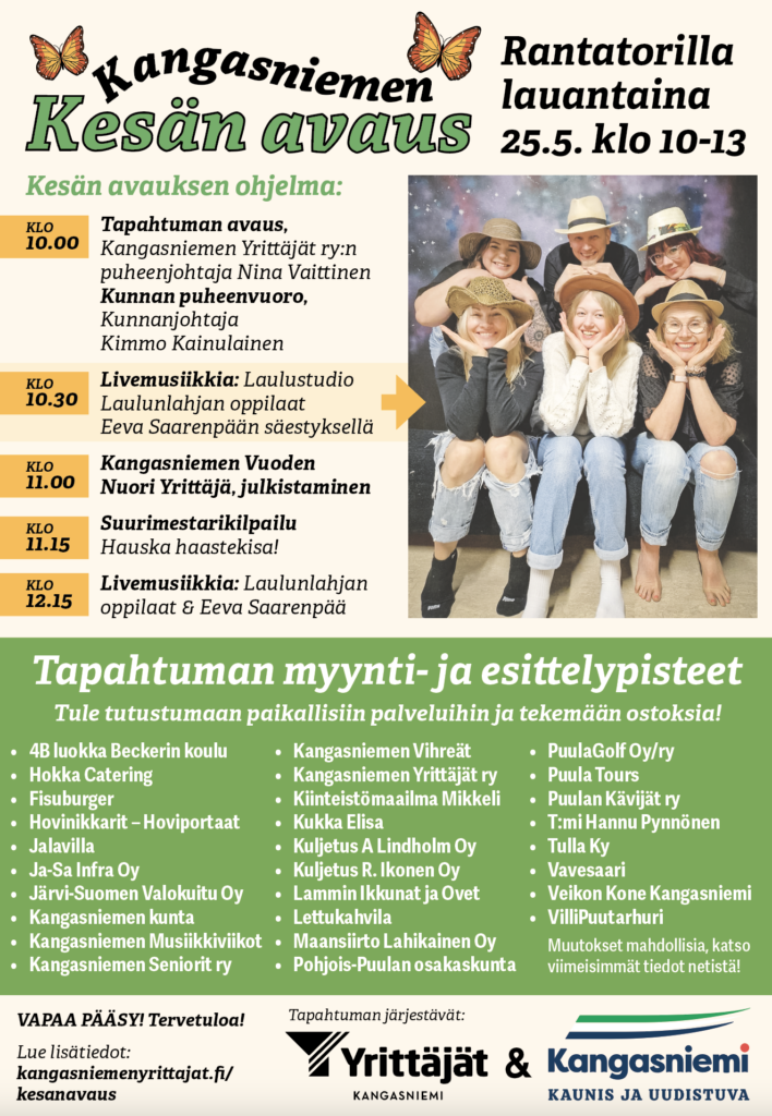 Kangasniemen Yrittäjät ry ja Kangasniemen kunta järjestävät perinteisen Kangasniemen kesäkauden avauksen Rantatorilla lauantaina 25.5.2024 klo 10-13. Tervetuloa!