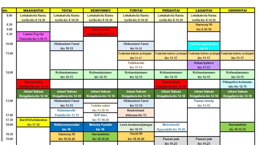 Viikko-ohjelmaan on koottu paikkakunnan kesän toistuvia tapahtumia. Osa tapahtumista on ilmaisia ja osa maksullisia. Joihinkin tapahtumiin pyydetään ennakkoilmoittautumista. Tapahtuman päivämäärät sekä muita lisätietoja on ohjelman toisella sivulla ja tarkemmat tiedot saa tapahtuman järjestäjältä. Muutokset tapahtumiin ovat mahdollisia!