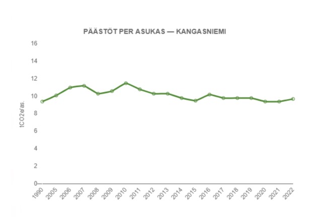 Kuva 2. Asukaskohtaisten päästöjen kehitys Kangasniemellä vuosina 2005-2022 (Suomen ympäristökeskus 2024).