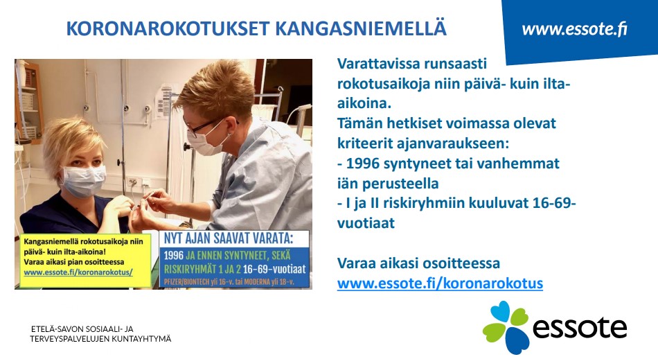 Julkaistu: 28.5.2021 Kangasniemen koronarokotukset 1996 tai ennen syntynyt, tai 16-69-vuotias THL:n riskiryhmiin kuuluva, VARAA AIKA TÄSTÄ. Katso tiedote tästä.
