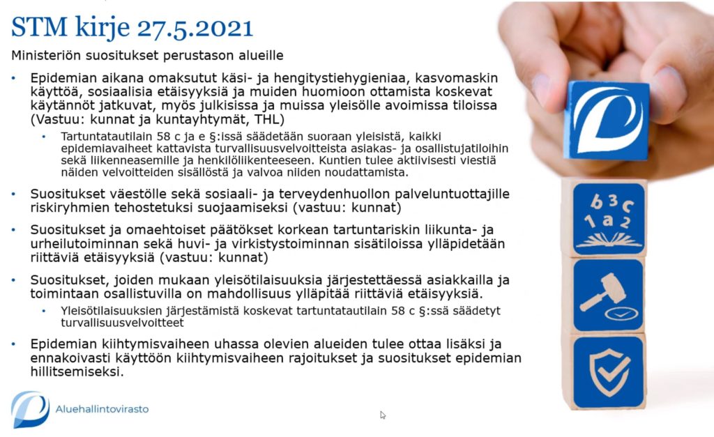 Aluehallintovirasto on kieltänyt kaikki sisä- ja ulkotiloissa järjestettävät yleisötilaisuudet ja yleiset kokoukset, joihin osallistuu yli 50 henkilöä. Sisätiloissa ja alueellisesti rajatuissa ulkotiloissa voidaan kuitenkin järjestää yleisötilaisuuksia ja yleisiä kokouksia, joihin osallistuu yli viisikymmentä (50) henkilöä edellyttäen, että turvallisuus niissä voidaan varmistaa. Päätös on voimassa 17.6.2021 asti. Koulujen kevätjuhlat järjestetään voimassa olevien rajoitusten sallimissa puitteissa. Koulut tiedottavat järjestelyistä huoltajille.