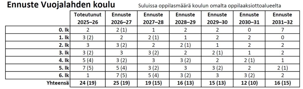 Kouluverkkoa koskeva asia käsitellään sivistys- ja hyvinvointilautakunnassa kesäkuussa. Kunnanhallitus tekee esityksen kunnanvaltuuston päätettäväksi syksyllä 2026. Mahdolliset Vuojalahden koulun ja Vuojalahden päiväkodin lakkauttamiset voisivat toteutua aikaisintaan 1.8.2027.