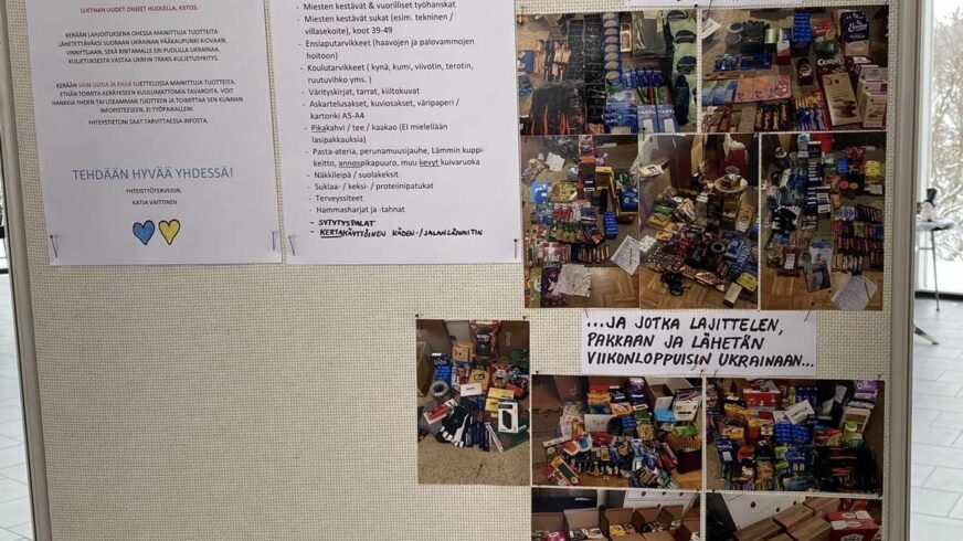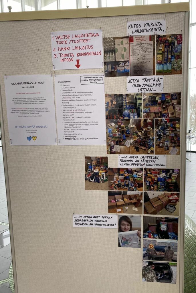 Kunnantalon aulassa (ma-pe klo 9-15) kohdennettu keräys ukrainalaisille. Lahjoitetut tavarat lähetetään Ukrainaan. Näin voit osallistua keräykseen: Hanki toivelistalla oleva tuote ja toimita se Kunnantalon infoon.