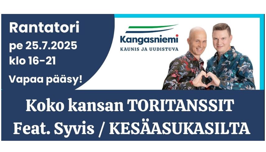 Uudistetulla Rantatorilla järjestetään perjantaina 25.7.2025 klo 16-21 Koko kansan toritanssit, jossa yleisöä viihdyttää Syvälahden Viihdekeskuksen esiintyjät tangokuninkaat Marko Maunuksela ja Jukka Hallikainen & VHS-orkesteri.